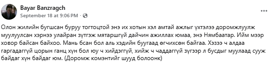 “Олон жил бугшсан буруу тогтоцтой энэ их хотын хэл амтай ажлыг үхтэлээ доромжлуулж, муулуулсан хэрнээ улайран зүтгэж, мятаршгүй дайчин ажиллах юм аа энэ Нямбаатар. Ийм мээр ховор байсан. Мань байсан бол аль хэдийнэ буугаад өгчихсөн. Хэзээ ч алдаа гаргадаггүй цорын ганц хүн бол юу ч хийдэггүй, хийж ч чаддаггүй. Зүгээр л бусдыг муулж суудаг хүн байдаг юм” хэмээн бичсэн байлаа.