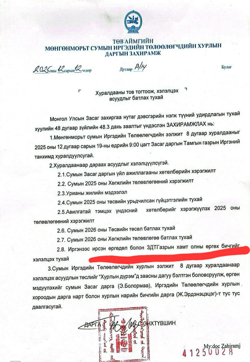 Гэтэл Төв аймгийн Төрийн захиргаа удирдлагын хэлтсийн дарга Г.Мөнхгэрэл гэх эмэгтэй өчигдөр буюу 2025.12.18-нд ёс зүйн доголдолтой Засаг дарга Э.Болормааг зөөлөн сэнтийгээс нь салгахгүйн тулд Төрийн албаны тангаргаасаа няцаж, Мөнгөнморьт сумын ЗДТГ-ын албан хаагчдыг нэг нэгээр нь дуудан уулзаж ажиллавал ажилла, чадахгүй бол ажлаа өгөөд яв гэх зэргээр сүрдүүлэн дарамталж байгаа гэнэ үү! Үүнээс 2 өдрийн өмнө аймгийн засаг дарга бөгөад АН-ын дарга Л.Төмөрчөдөр нь мөн л Мөнгөнморьт суманд очиж иргэдтэй уулзалт хийх нэрээр хүн зоддог засаг дарга эмэгтэйг өмөөрч байгаад буцсан гэх. Яагаад ойр ойрхон аймгаас хүмүүс ирэх болов гэхээр өнөөдөр буюу 2025.12.19-нд тус сумын ИТХ нь хуралдаж иргэд болон ЗДТГ-ын албан хаагчдаас гаргасан өргөдөл гомдлыг хэлэлцэх гэж бгаа тул энэ асуудлыг хасуулах зорилготой байна гэж хардахад хүргэж байна. Хардах ч юу байхав дээ ойлгомжтой байна